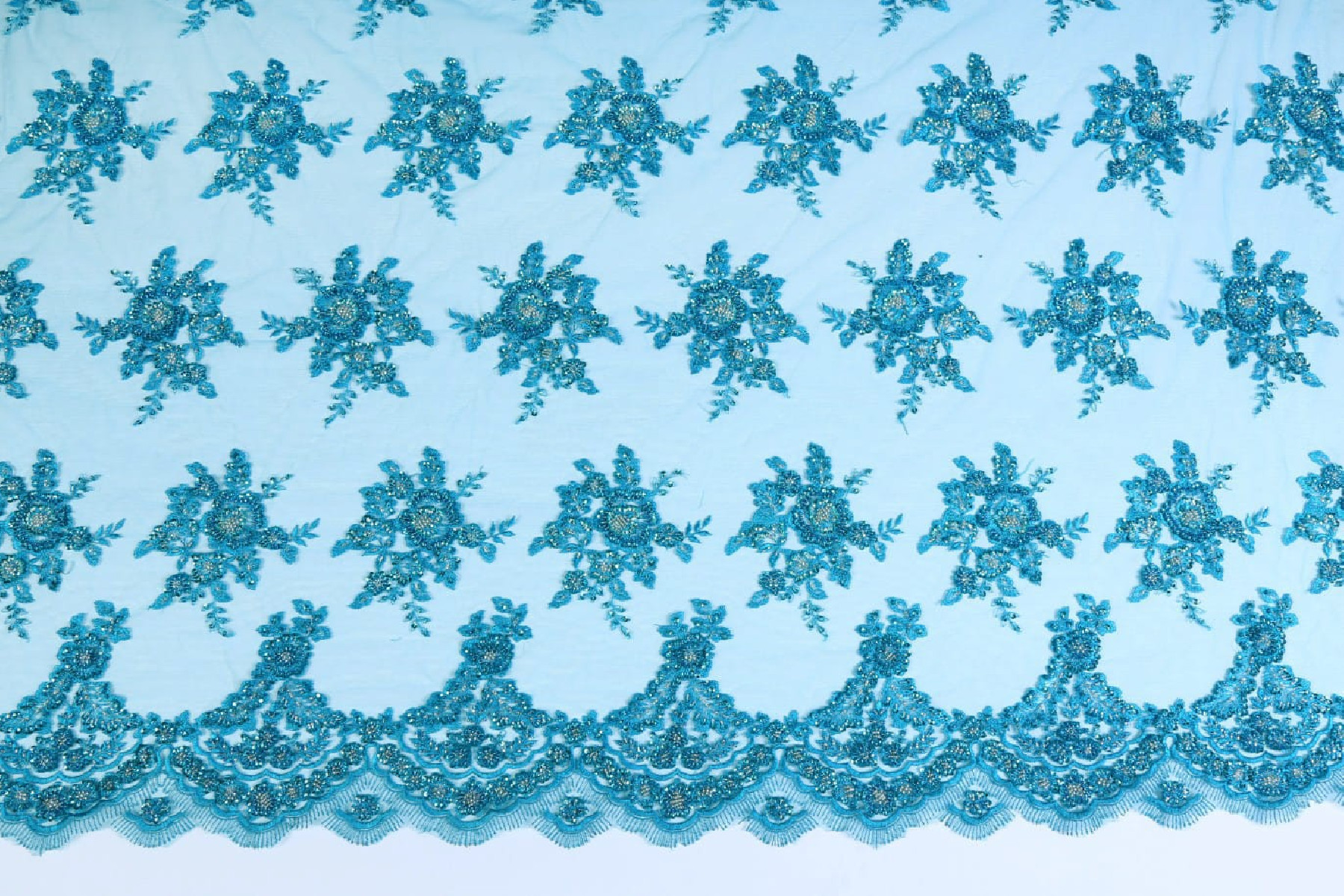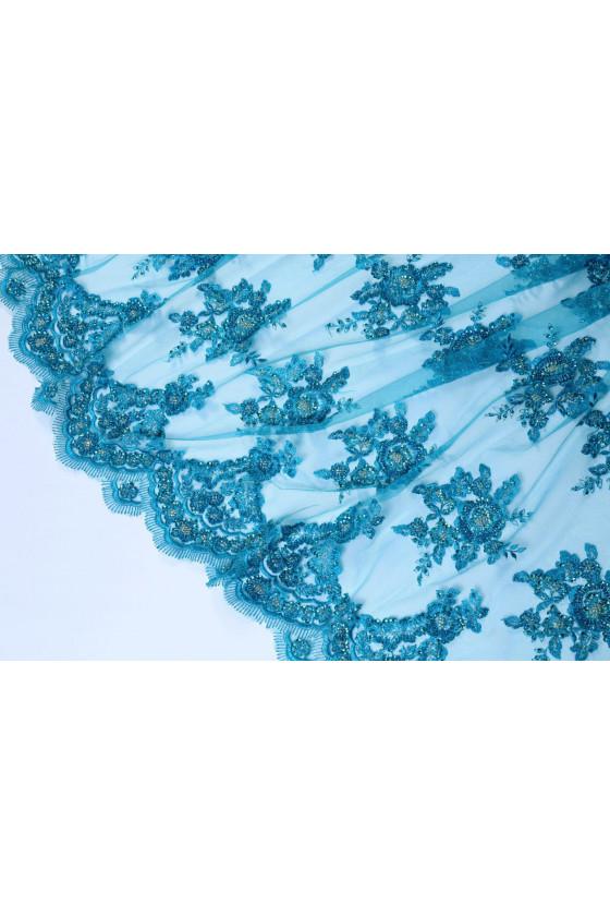 Vacker spets broderad med pärlor. Tyget är icke-elastiskt, tungt, färdigt på båda sidor med en tand. Perfekt för klänningar eller blusar.