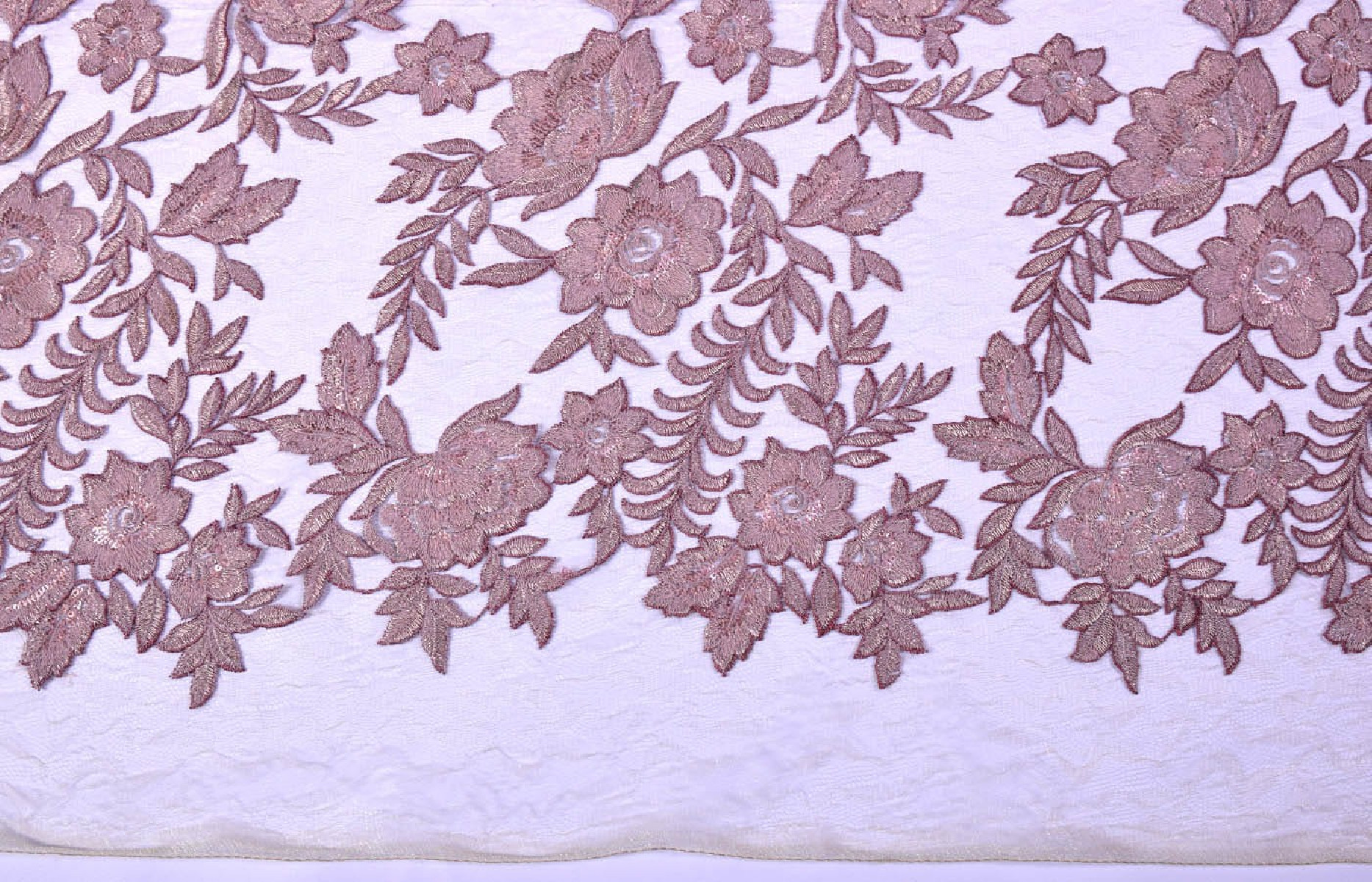 Vacker spets dekorerad med paljetter. Tyget är färdigt med en tand på båda sidor. Perfekt för klänningar, blusar. I mitten av spetsen finns ett hål som är ca 2 cm stort.