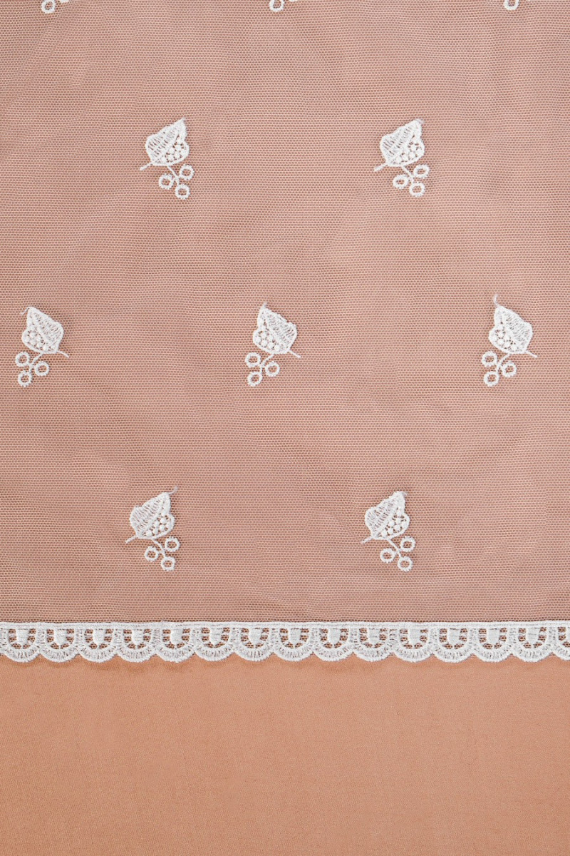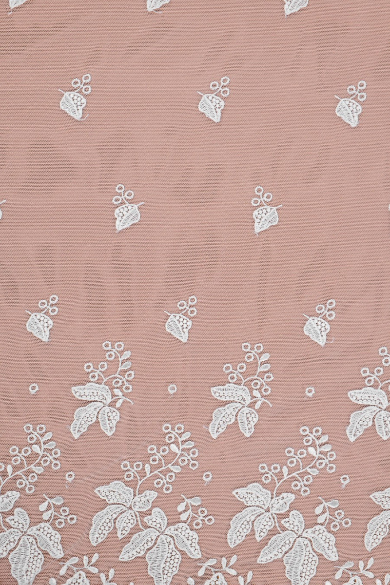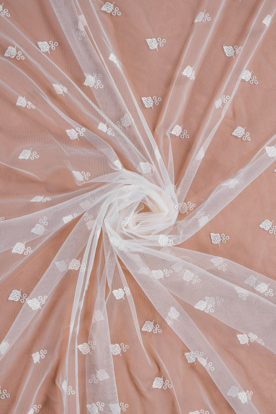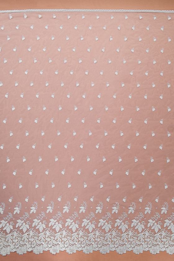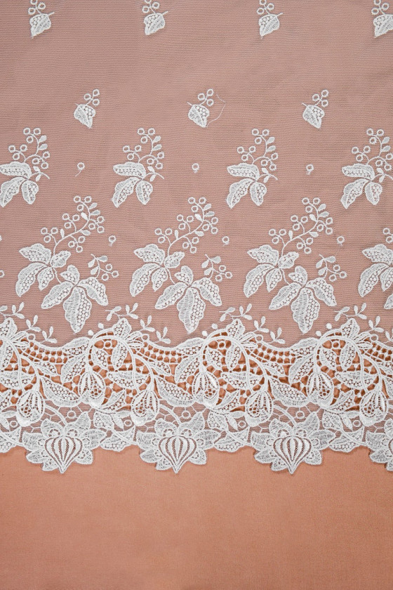 Vacker spets till brudklänningar eller blusar. Tyget är färdigt på ena sidan med en bred tand och på andra sidan trimmat med en finish på 1 cm.