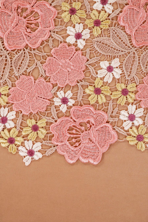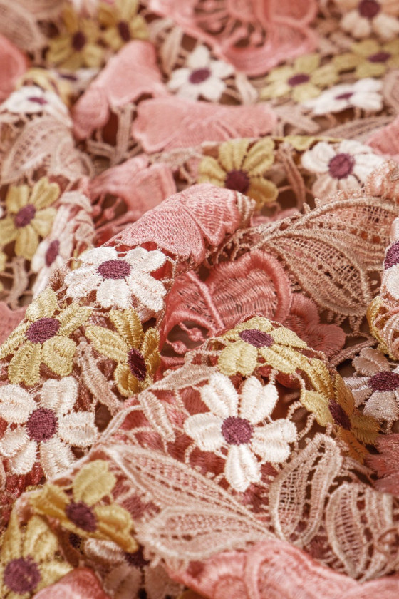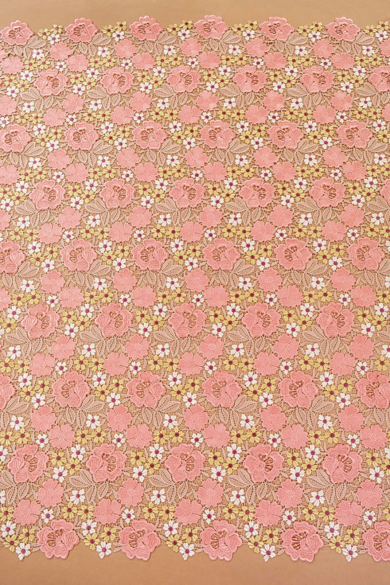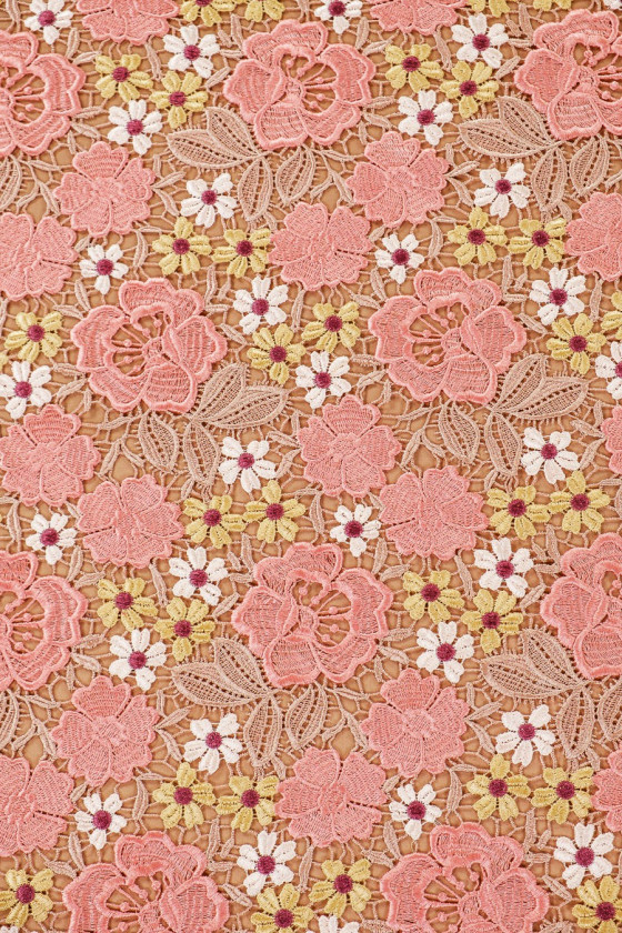 Vacker, tjock guipurespets med pastellfärgade blommor (rosa och gula). Perfekt för eleganta sommarklänningar eller kjolar.
