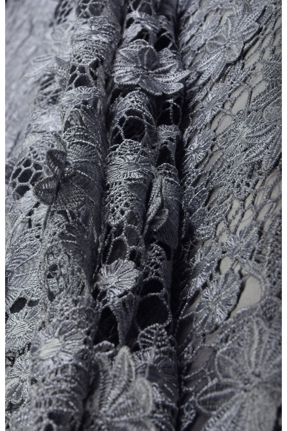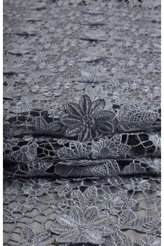 3D guipure spets i silvergrå färg med löst sydda blommor, mycket imponerande. För en vacker effekt rekommenderar vi att du väljer ett foder, t.ex. av satin.