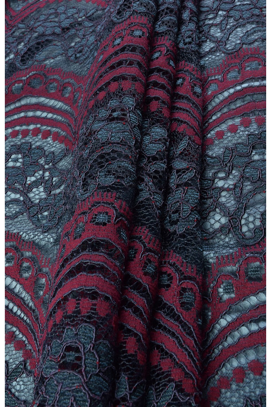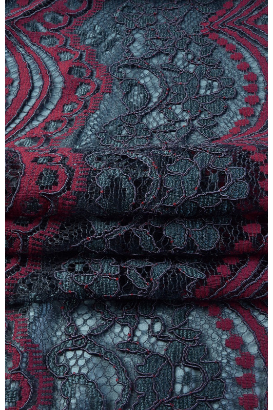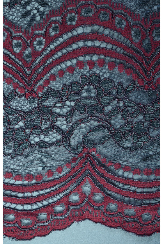 Fransk spets vävd av vinröda och gröna trådar. Det hela skapar en komposition av ränder och vågor som är ca 15 cm breda.