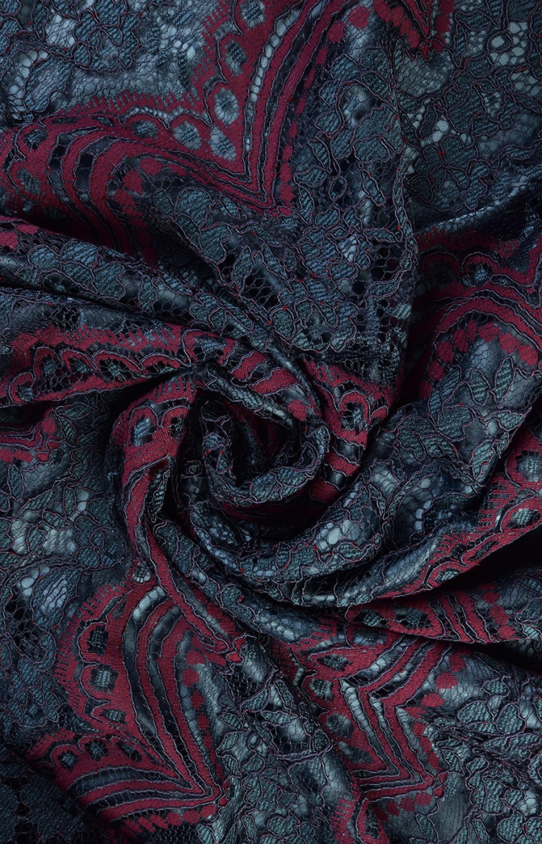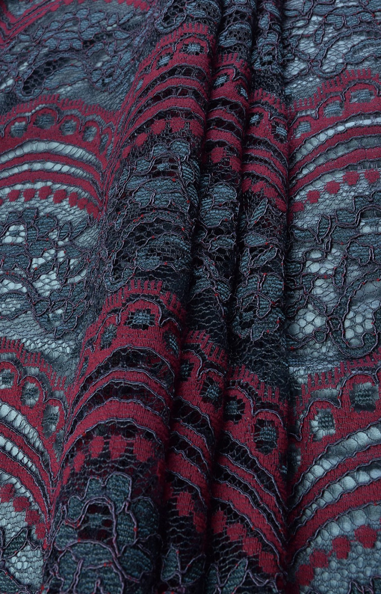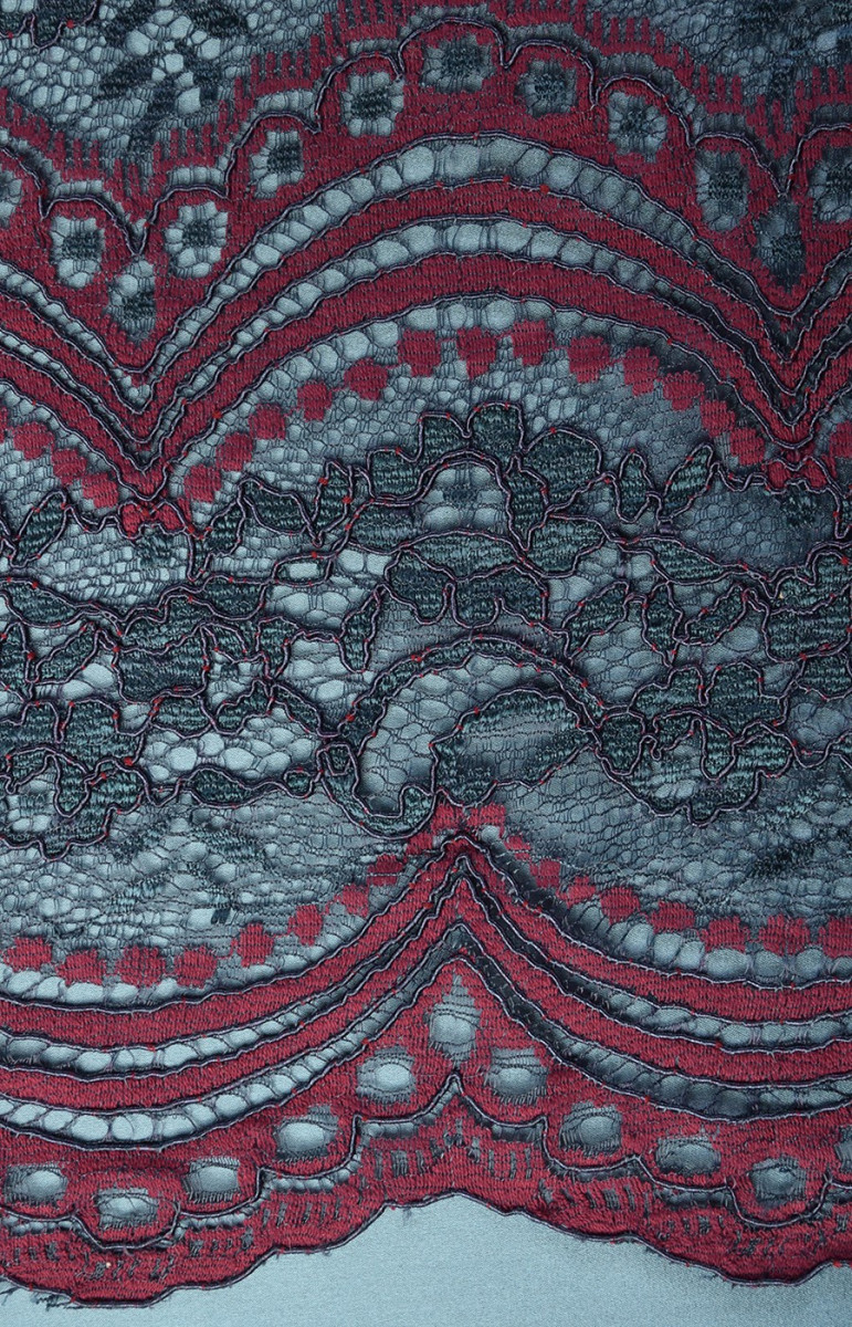 Fransk spets vävd av vinröda och gröna trådar. Det hela skapar en komposition av ränder som är ca 15 cm breda.