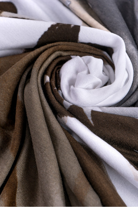 Vackert elastiskt viskosstickat tyg med blommönster. Stora (50 cm) bruna blommor är tryckta på en ecru-bakgrund och ett gråbeige dekorativt mönster längst ner på kupongen. Tyget kommer i en kupong med måtten 105*160 cm.