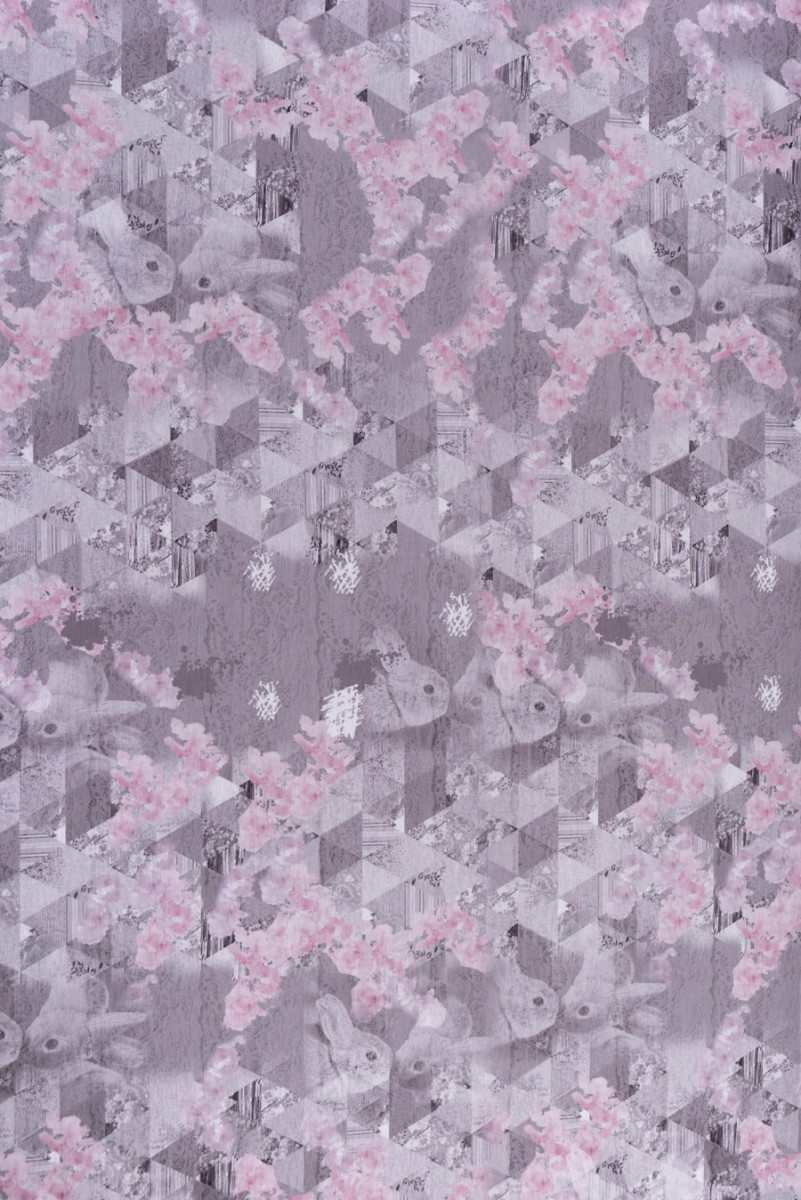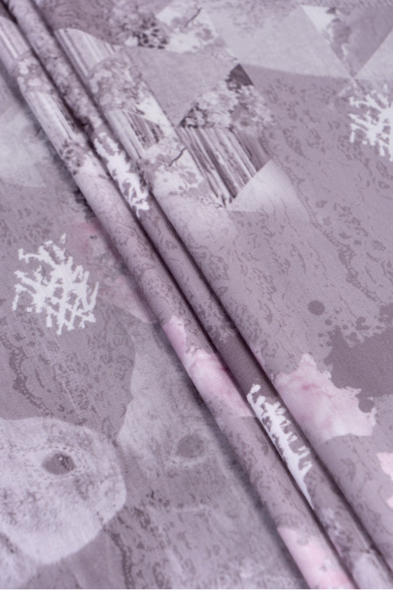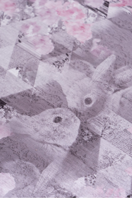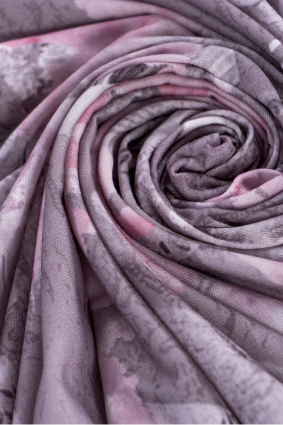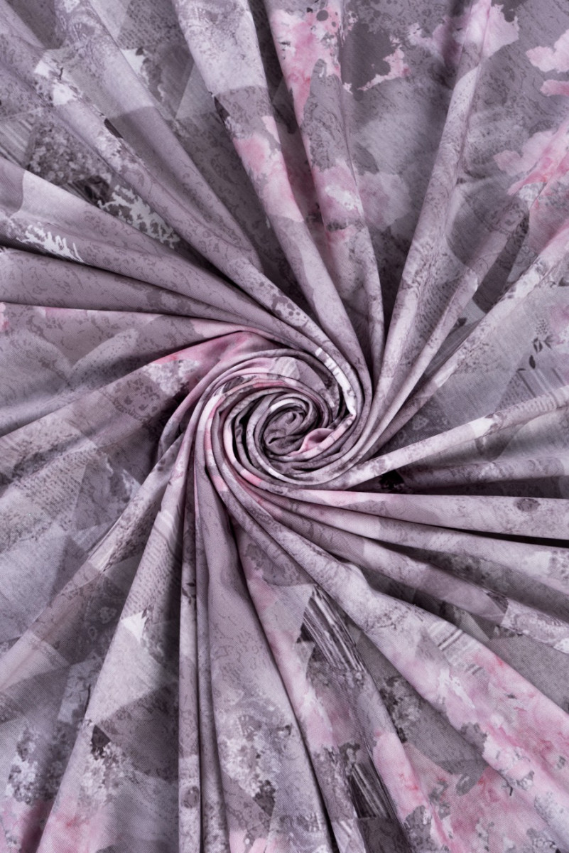 Italiensk viskosstickad tröja i pastellfärger. Elastiskt tyg av mycket god kvalitet. Mönstret är en subtil kombination av blommor, geometri och en djuraccent. Perfekt för att sy en klänning, blus, t-shirt.