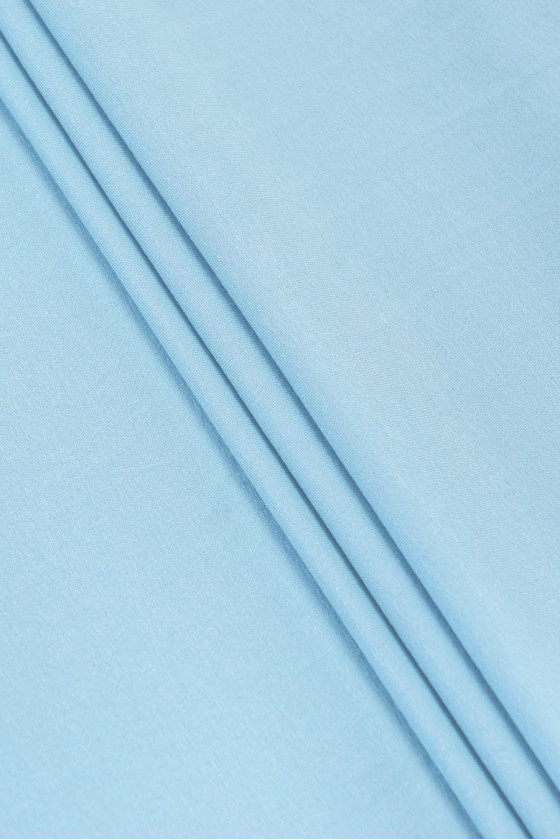 Stickat tyg (vikt 200 g/m2) vävt av viskos 92% och elastan 8% i ljusblå färg. Tyget är elastiskt, mjukt draperat, mycket behagligt att ta på och är lämpligt för att sy sommarblusar, klänningar och halsdukar.