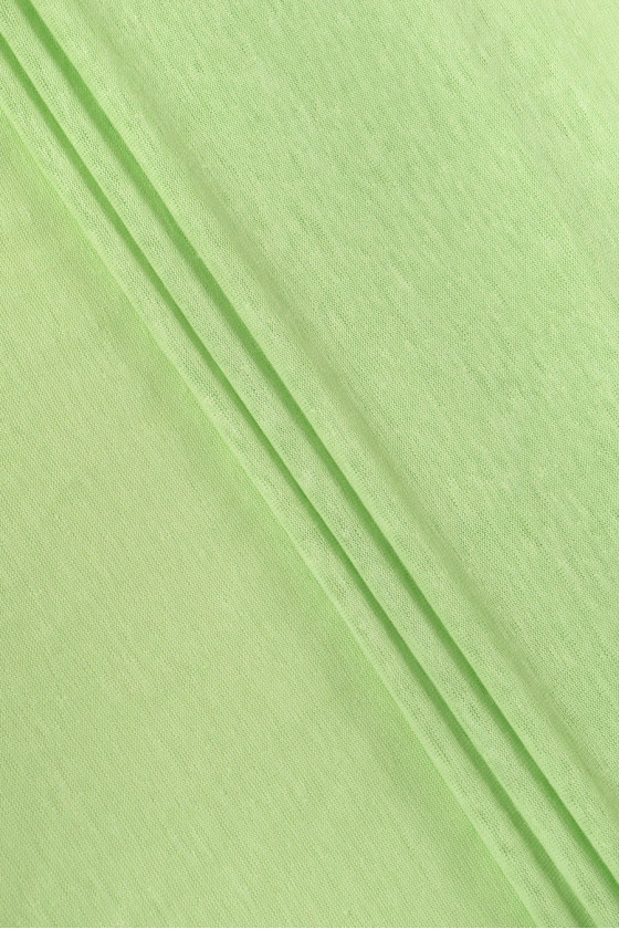 Italienskt viskosstickat tyg i ljusgrönt - mycket bra kvalitet. Det stickade tyget är elastiskt, lätt genomskinligt med en lösare väv som liknar linne. Perfekt för att sy en blus eller t-shirt.