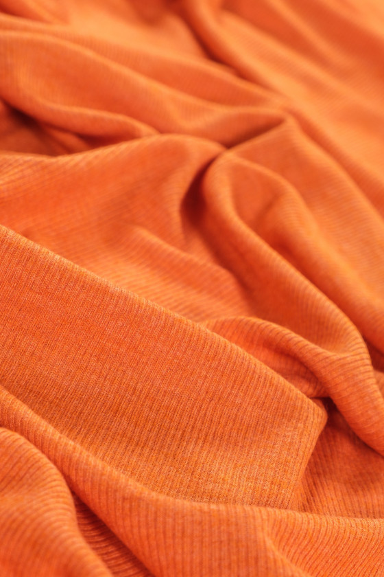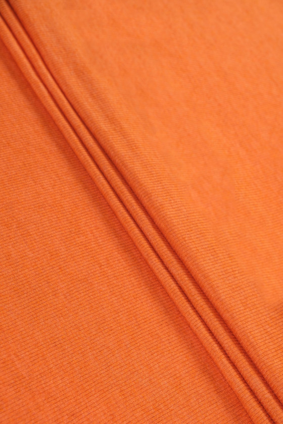 Italienskt bomullsstickat tyg i orange med en bredd på 120 cm. Tyg med en karakteristisk, ribbad väv som liknar en rand, perfekt för att sy en klänning eller blus.