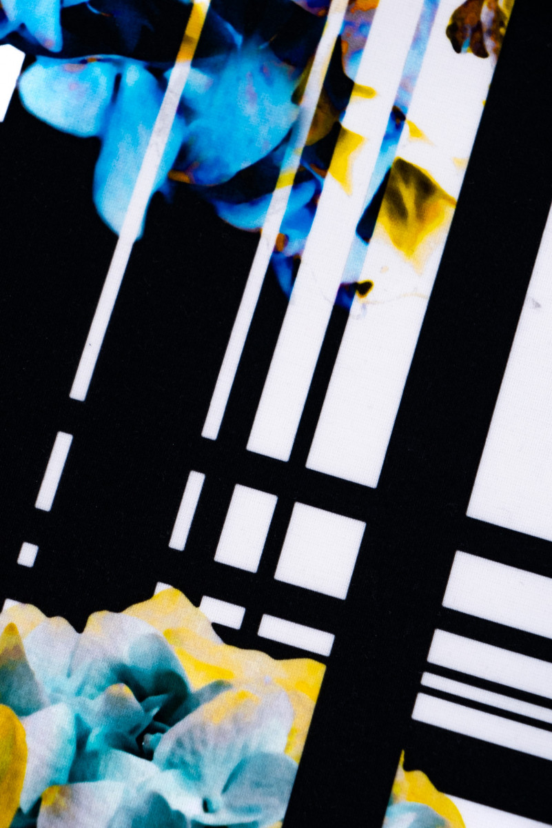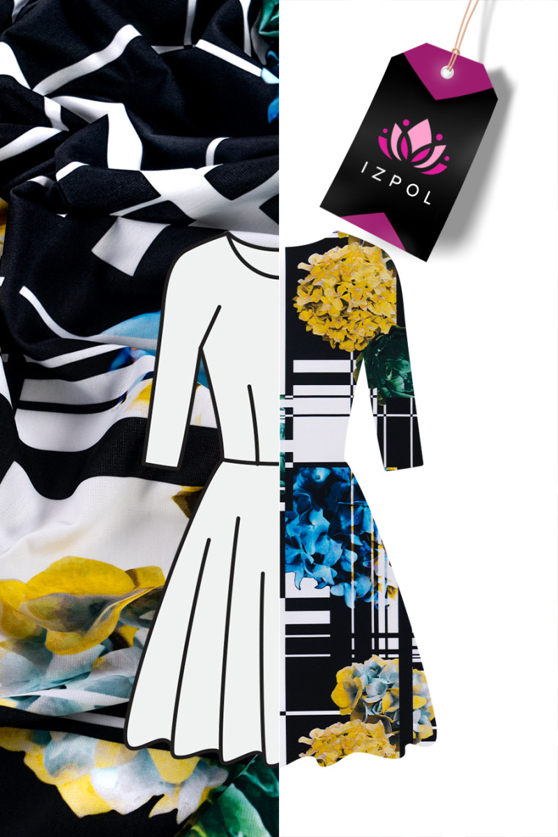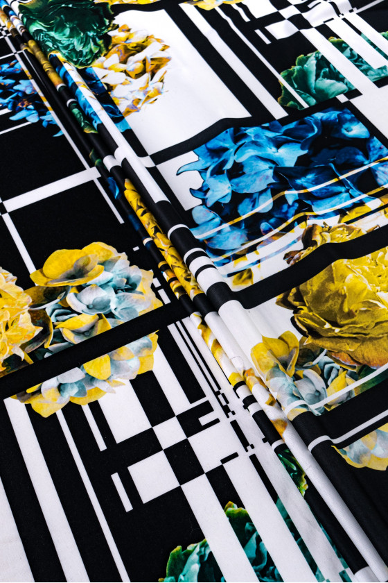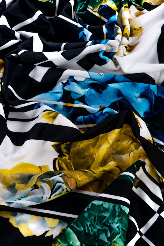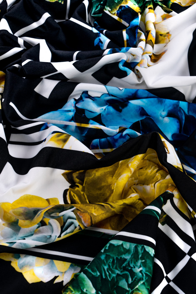 Italiensk jerseystickad tyg med lapptäcksmotiv med färgglada, stora blommor och svartvitrutigt. Jersey är ett täckande, mjukt draperat stickat tyg som kan sys ofodrat. Den är perfekt för vardagsklänningar, kjolar, jackor.