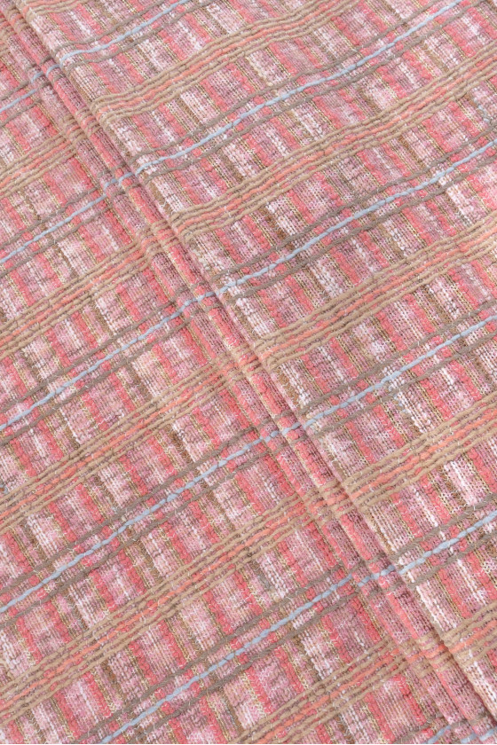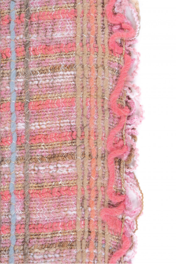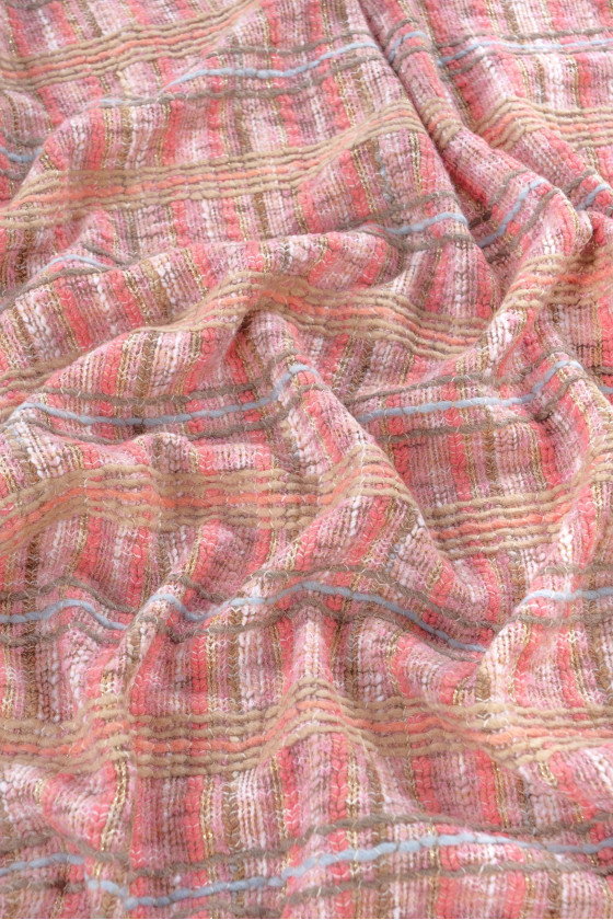 Italienskt tröjtyg i pastellfärger i rosa, beige och blått. Tyget är tjockare, fluffigt, icke-elastiskt med en guldlurextråd invävd i den.