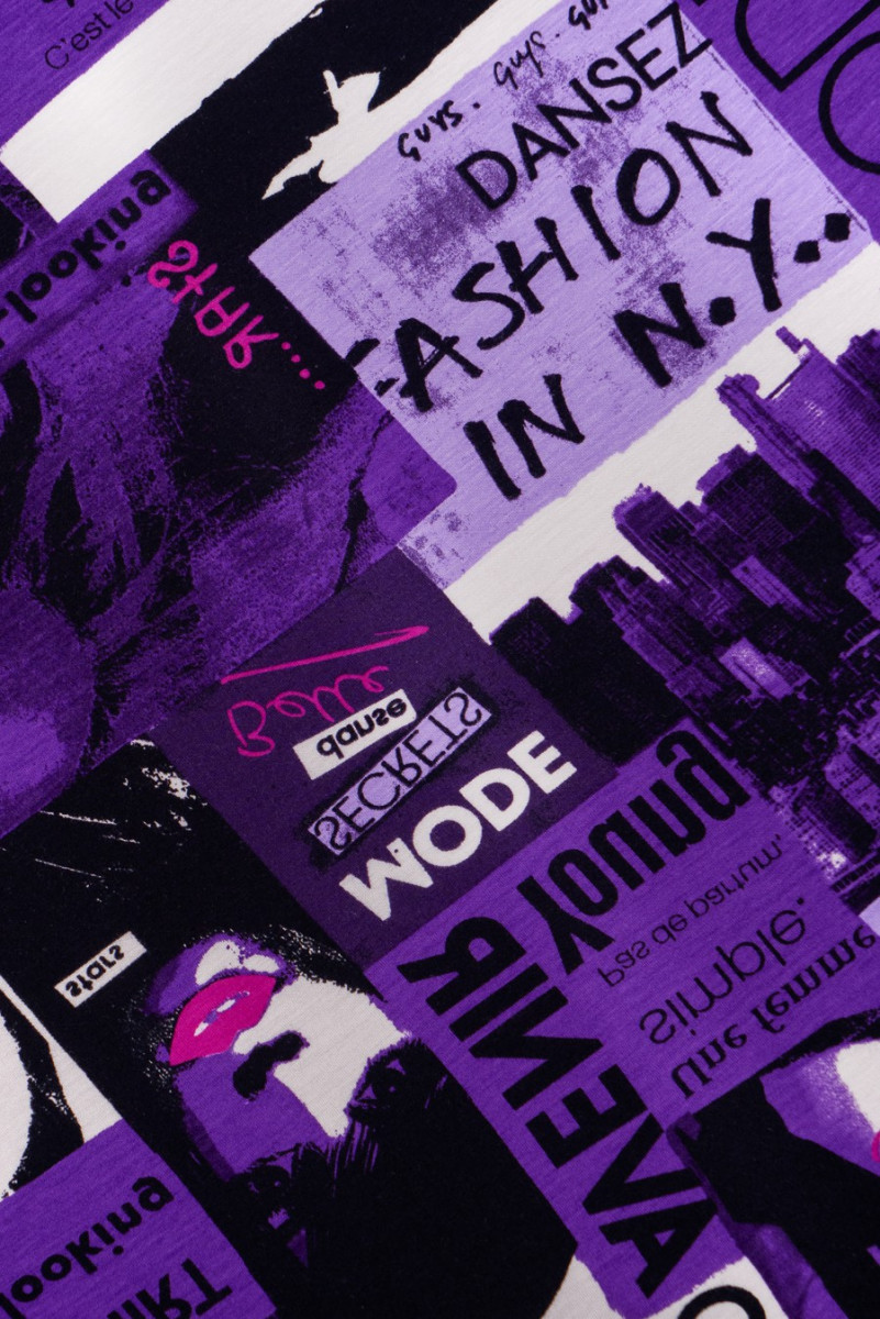 Elastiskt stickat viskostyg med tidningsmotiv i svart och lila med vita inslag.