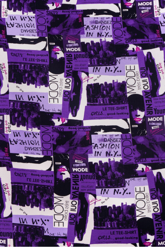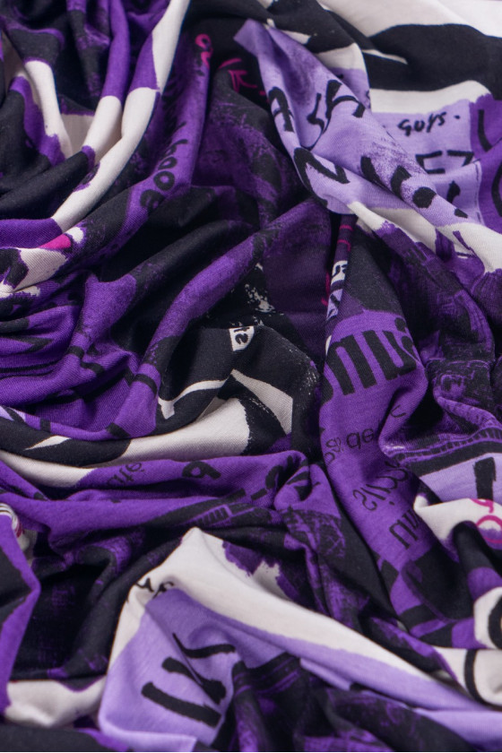 Elastiskt stickat tyg i viskos med tidningsmotiv i svart och lila med vita inslag.