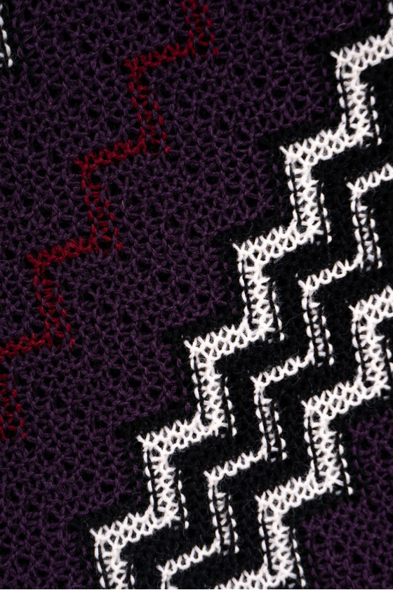 Italiensk tröja stickat tyg med en lös väv, vävd av naturlig ull, polyamid och akryl - ett karakteristiskt motiv av färgglada sicksackmönster från det välkända modehuset. Tyget är perfekt för att sy en tröja, kofta, väst, poncho, sjal.