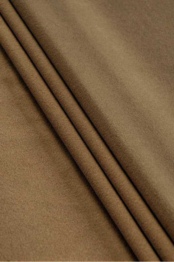 Italienskt kapptyg i färgen mörk, smutsig kamel. Vävd av 80% naturlig ull och 20% kashmir. Ylletyger är idealiska för ytterkläder (kappa, jacka, väst) eftersom de värmer och samtidigt låter huden andas. Tillsatsen av kashmir gör den ännu bättre isolerande, eftersom kashmir är varmare än fårull.