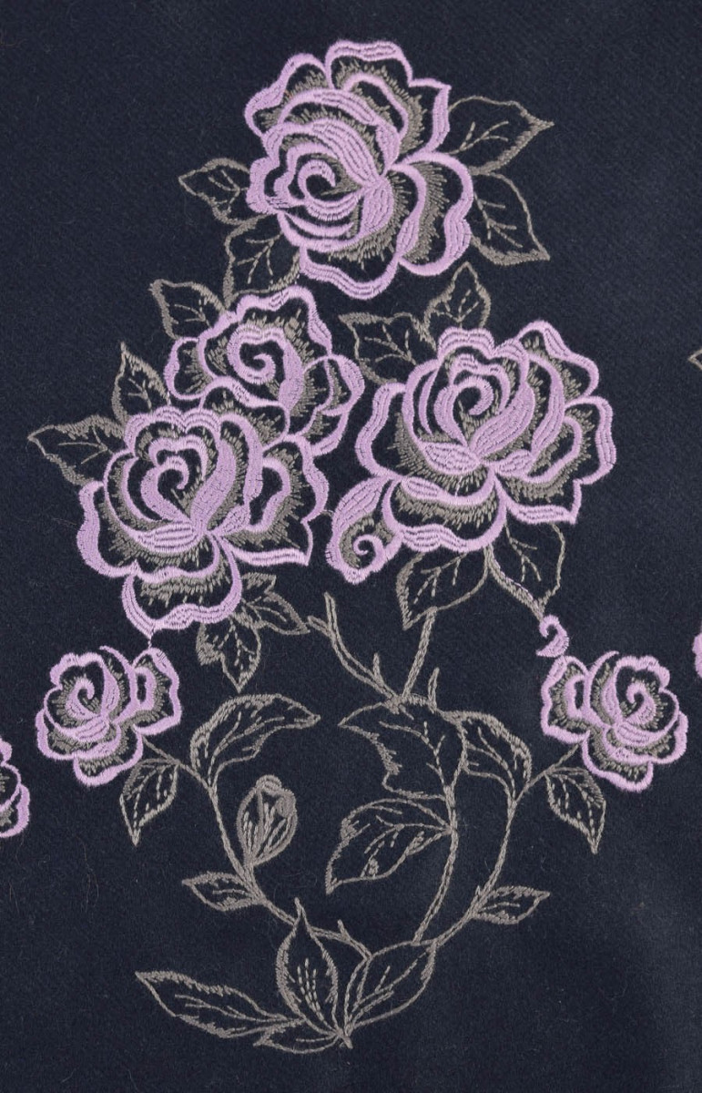 Italienskt kappatyg i 100% ull i marinblått, längs ena kanten finns en broderad ljung-olivfärgad, blommig rand ca 47 cm bred - tyget sys runt om.