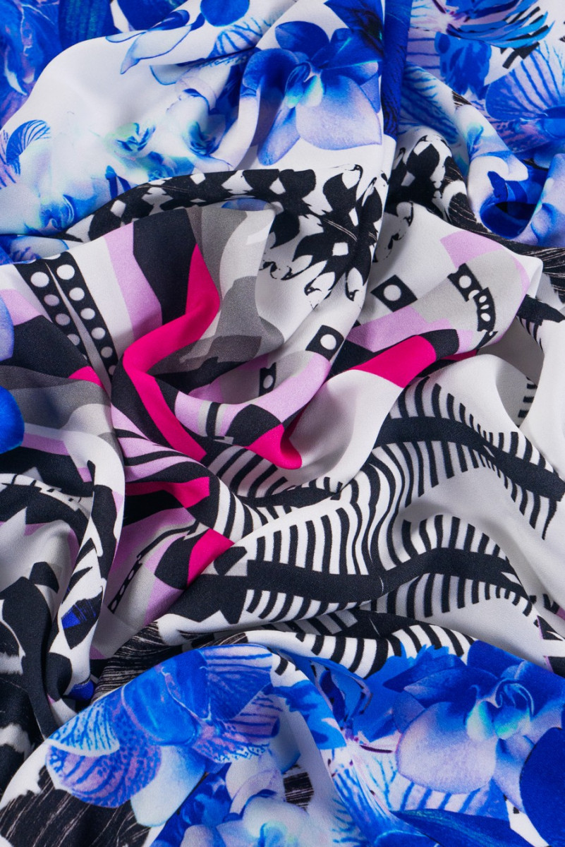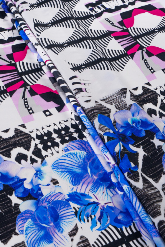 Italienskt tyg 100% viskos med georgetteväv. Ett intressant motiv av blommor och geometriska mönster på en vit bakgrund. Tyget kommer i en kupong med måtten 108 cm*155 cm.