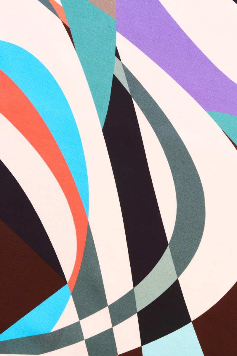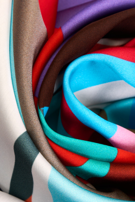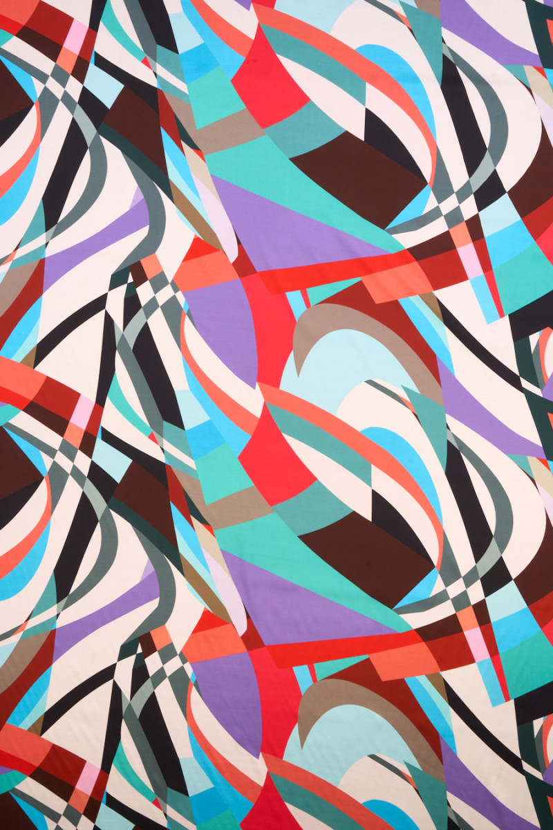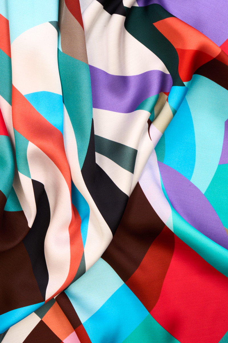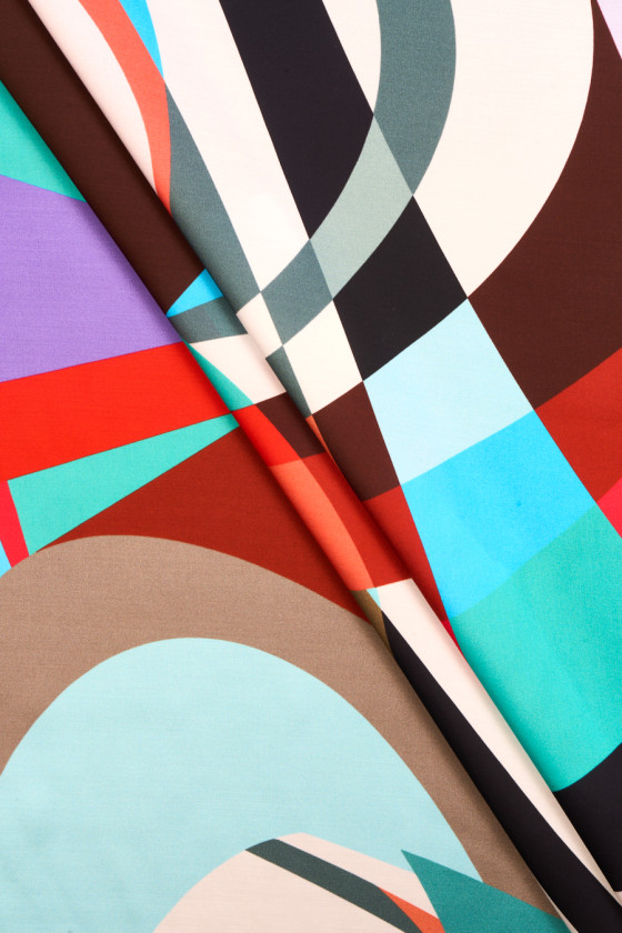 Italienskt tyg 100% viskos med färgglada geometriska motiv. Ett originellt mönster i energiska färger, bestående av element i olika storlekar och former. Tyget är satin, mjukt, böljande, lätt och mycket behagligt att ta på. Ett intressant förslag för unika outfits som klänningar, kjolar, blusar och skjortor.