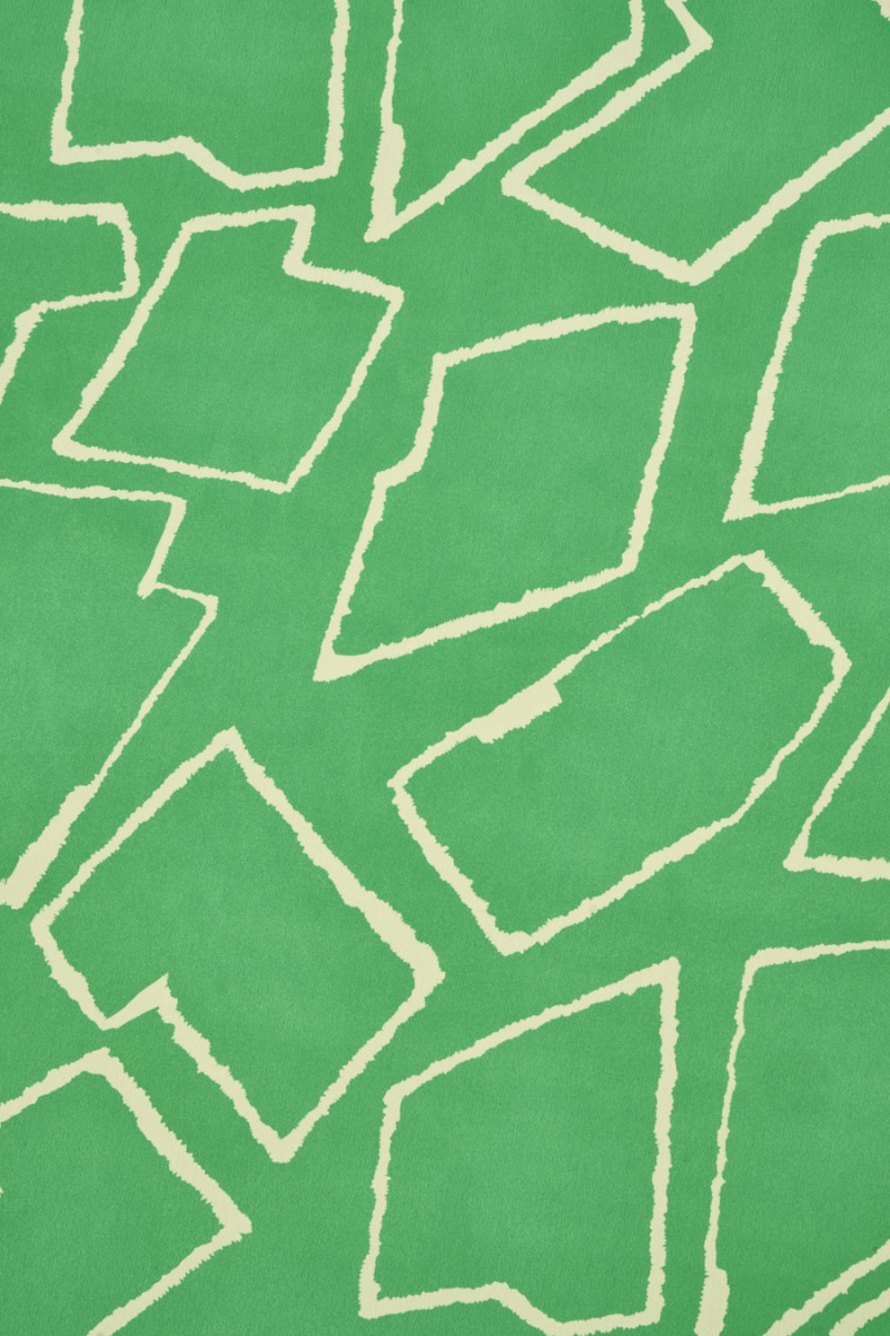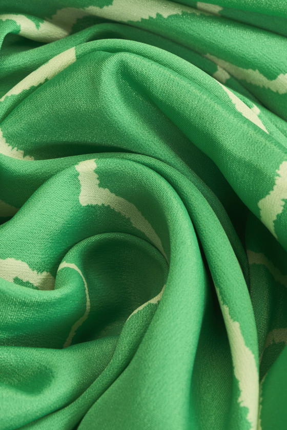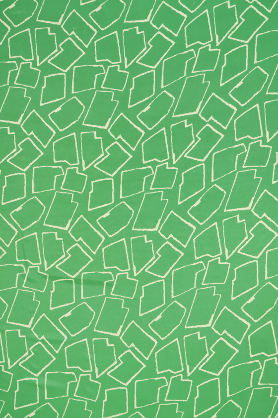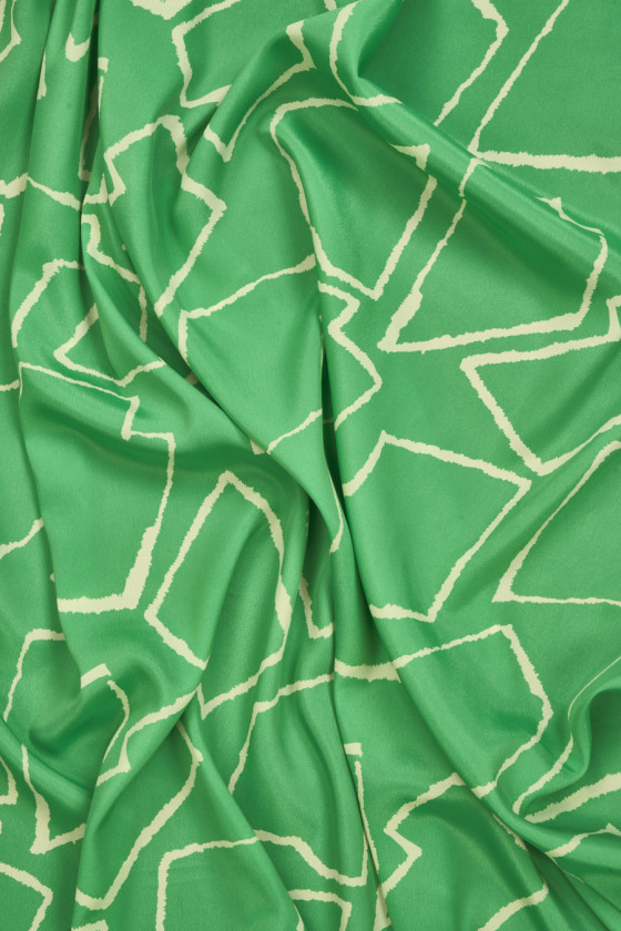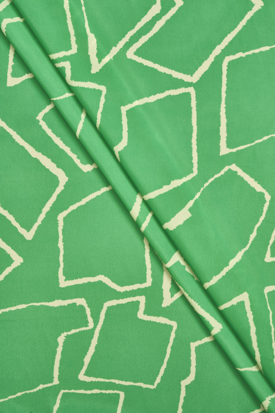 Italienskt tyg vävt av viskos och siden med geometriska motiv i ecru på grön botten. Ett tätt mönster föreställande olika former, arrangerade nära varandra. Tyget är tunt men täckande, lätt, icke-elastiskt och flytande. Ett fantastiskt tyg som man kan göra klänningar, blusar, skjortor och kjolar av.