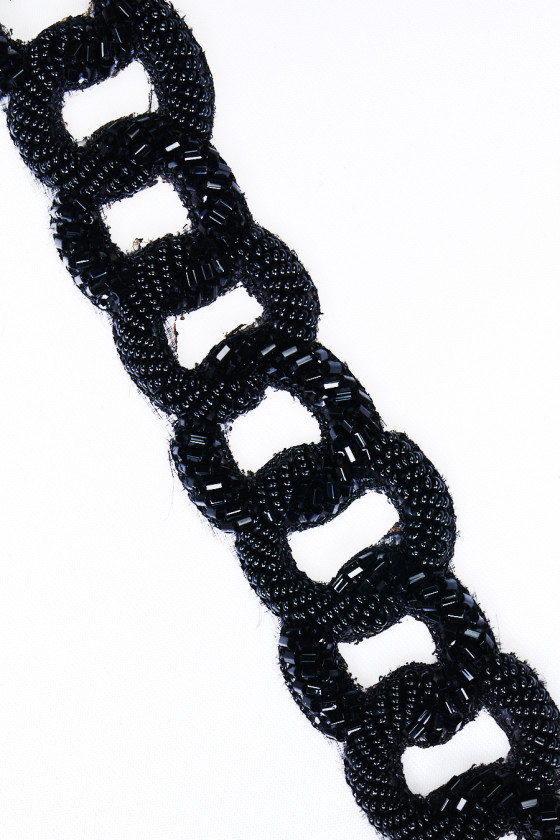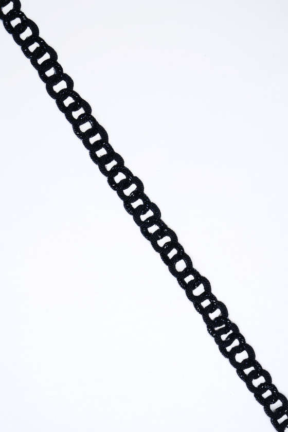 Italiensk sybehörstejp i en kupong 50 cm lång och 2,5 cm bred. Ett originellt motiv med runda, sammanvävda öljetter, omväxlande gjorda av två typer av svarta pärlor. Ett mycket elegant förslag för att dekorera en klänning eller blus. Ett band för fans av tidlöst svart med en modern twist. Om du behöver 1 m tejp, beställ 2 kuponger.