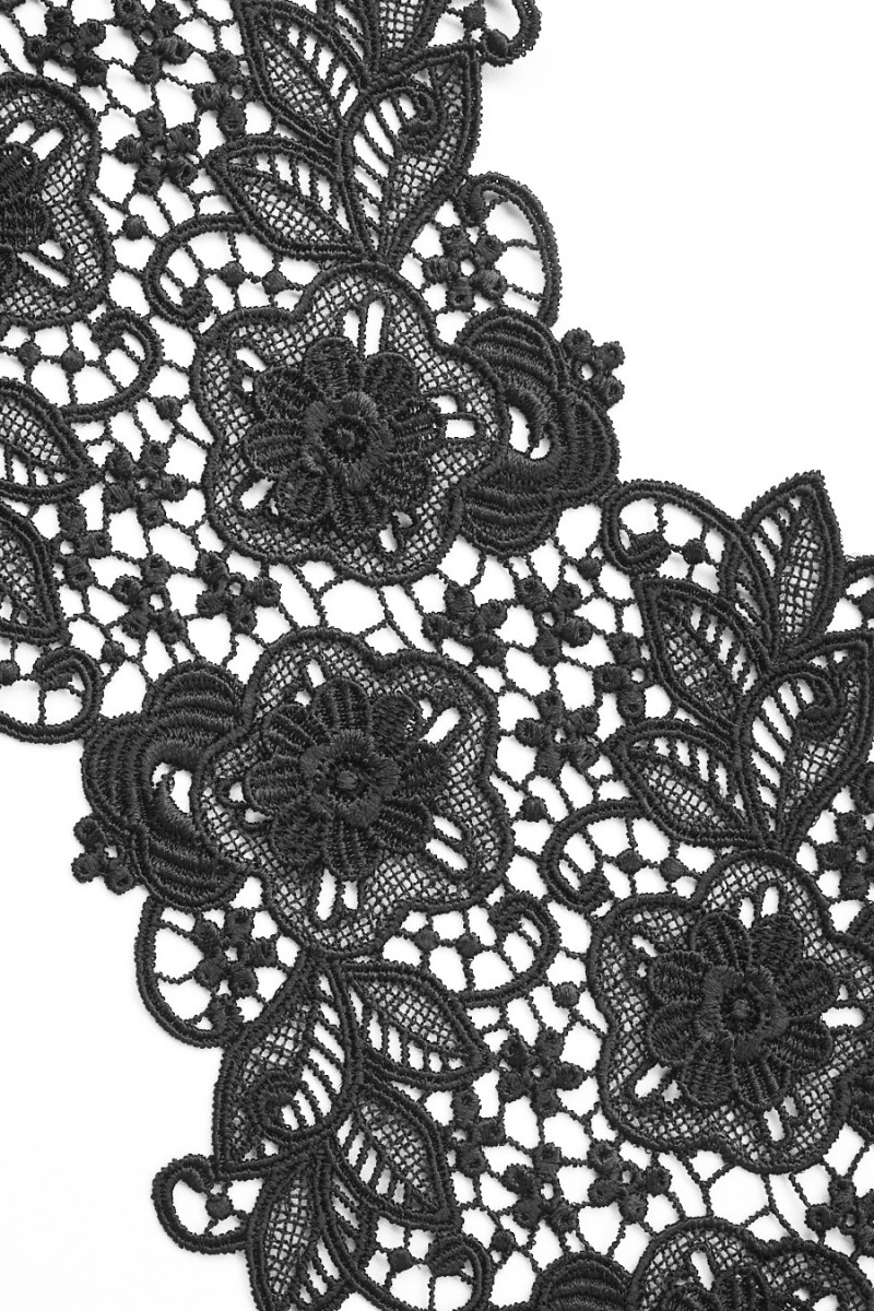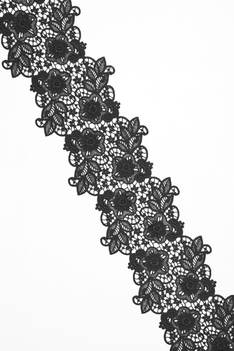Italiensk sybehörstejp - guipure i svart, 14 cm bred. Ett vackert motiv av blommor och blad kombinerat med små blommor och ett spindelnät. Dessutom syddes en mindre för den största blomman, som sticker ut något och skapar en 3D-effekt. Tejpen avslutas med en dekorativ tand på båda sidor. Ett fantastiskt förslag för efterbehandling av släta tyger.