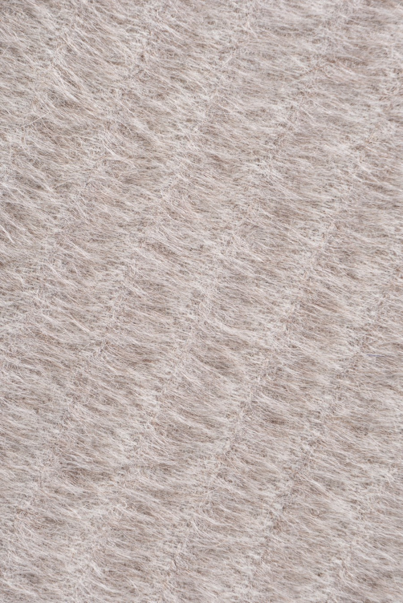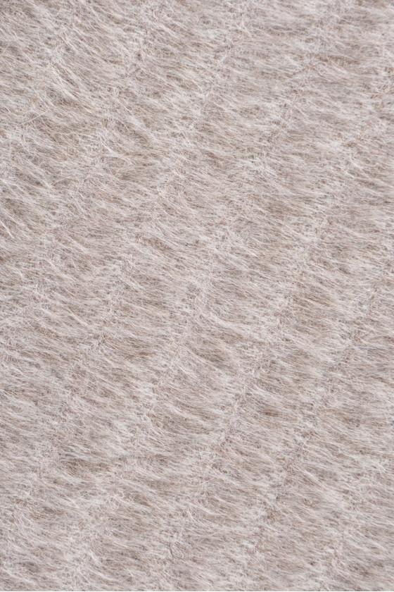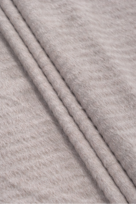 Italienskt kapptyg i kall beige. Vävd till originalränder av naturlig ull och alpacka. Tyget som innehåller alpackaull har utmärkt luftgenomsläpplighet och isolerande egenskaper, har en längre lugg och är mycket mjukt. Perfekt för att sy en kappa, jacka, väst.