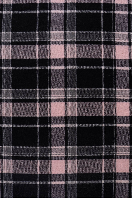 Italienskt kapptyg med en stor ruta (ca 8 cm) i ljusrosa och svarta färger. Vävd av naturlig ull och polyamid. Ylletyger är idealiska för ytterkläder (kappa, jacka, väst) eftersom de värmer och samtidigt låter huden andas.
