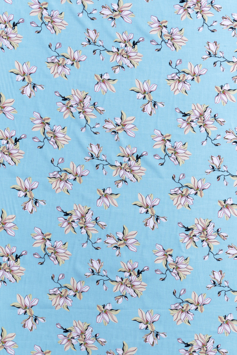 Italienskt 100% viskostyg i blått med ett tätt blommotiv. Blommorna varierar i storlek från 10 cm till 15 cm och är i écru, beige, svart med vinröda kanter. Tyget är tunt, icke-elastiskt med tuskaft. Ett mycket subtilt förslag för att sy en sommarklänning, blus eller kjol.