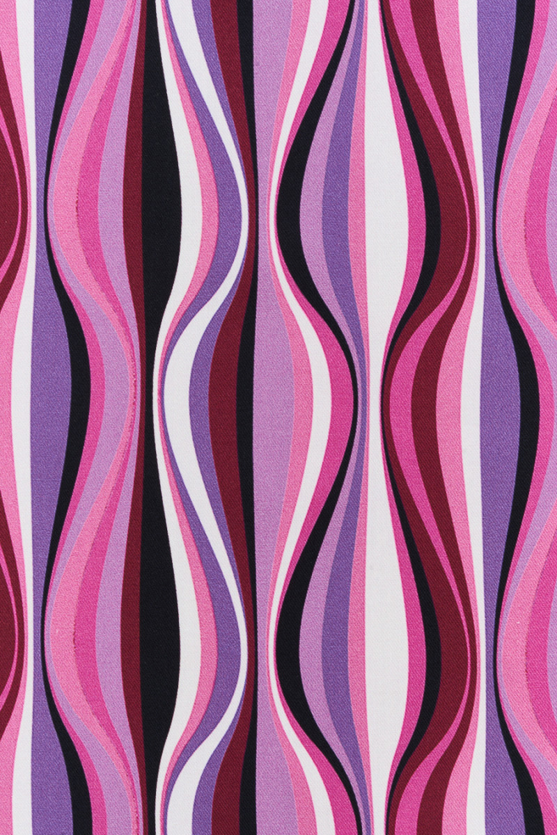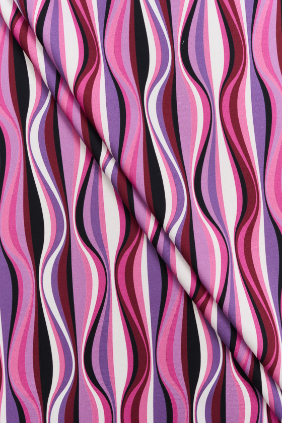 Italienskt tyg 100% viskos med vågmönster i rosa, lila, creme och svart färger. Tyget är mjukt, matt, flytande, ogenomskinligt och mycket behagligt att ta på. Ett färgglatt förslag som du kan sy en klänning, kjol, blus eller shorts av.