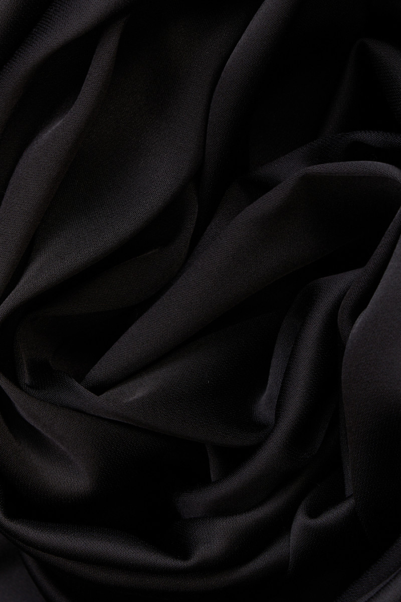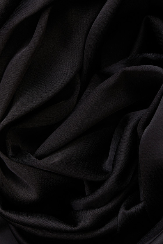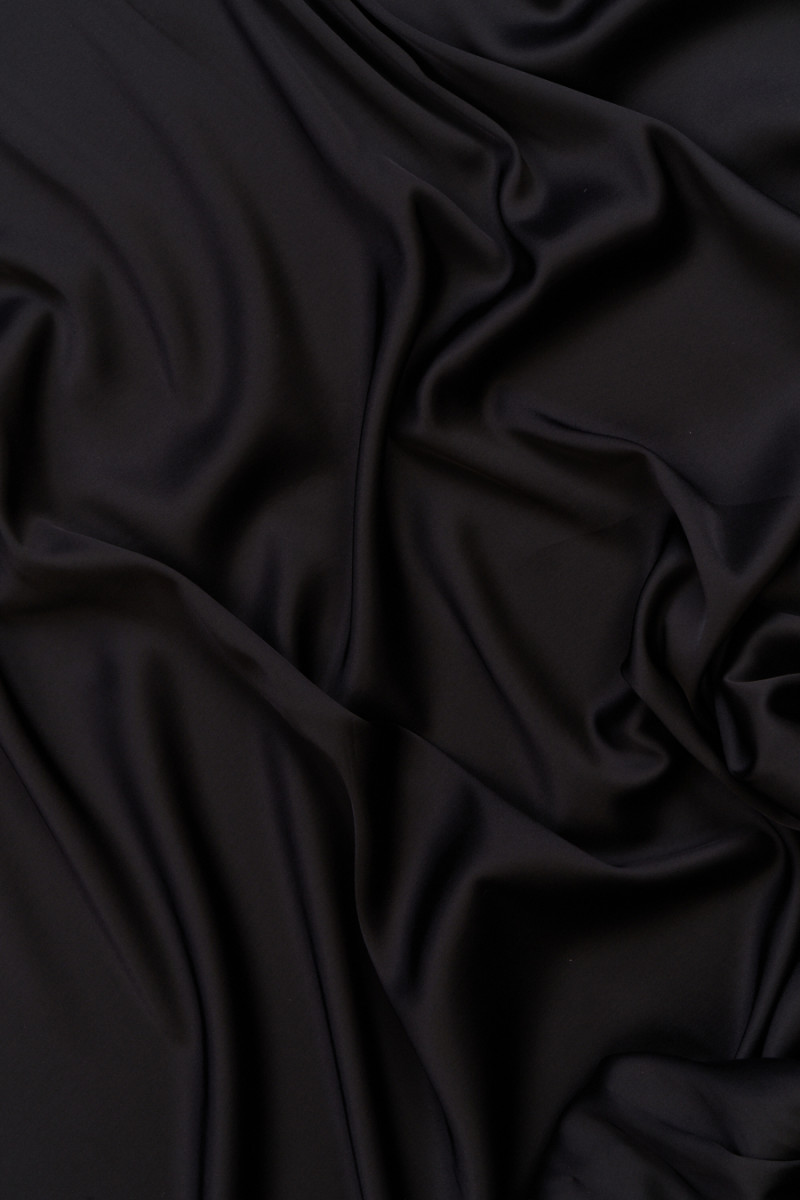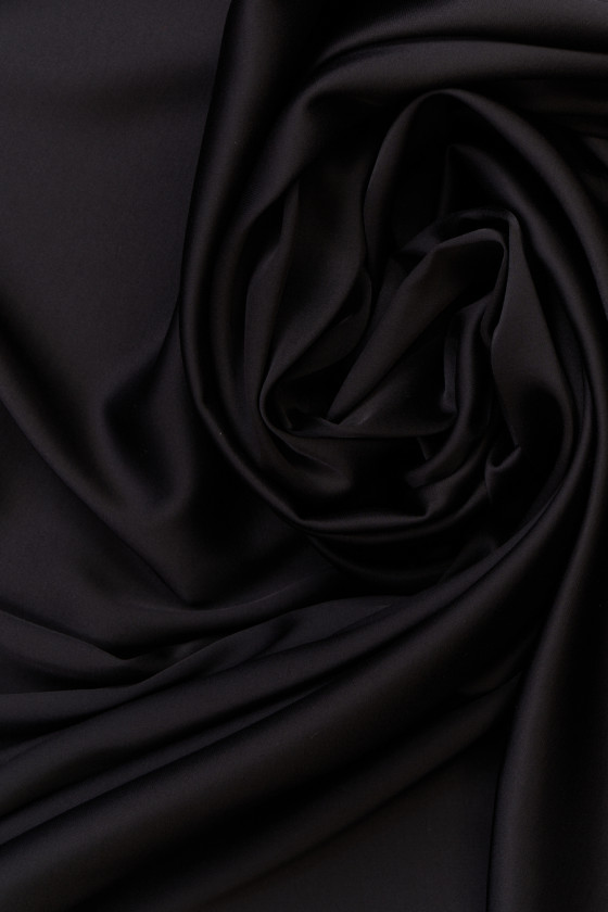 Italiensk viskossatin i två färger - vit och ljusgrå. Tyget är mjukt, flytande, icke-elastiskt, mjukt vid beröring och ogenomskinligt. Den ligger vackert och satinfinishen ger elegans till den. Du kan trolla fram luftiga klänningar, kjolar, skjortor eller blusar av den. Den kan också användas som bas för mer ömtåliga tyger och spetsar.