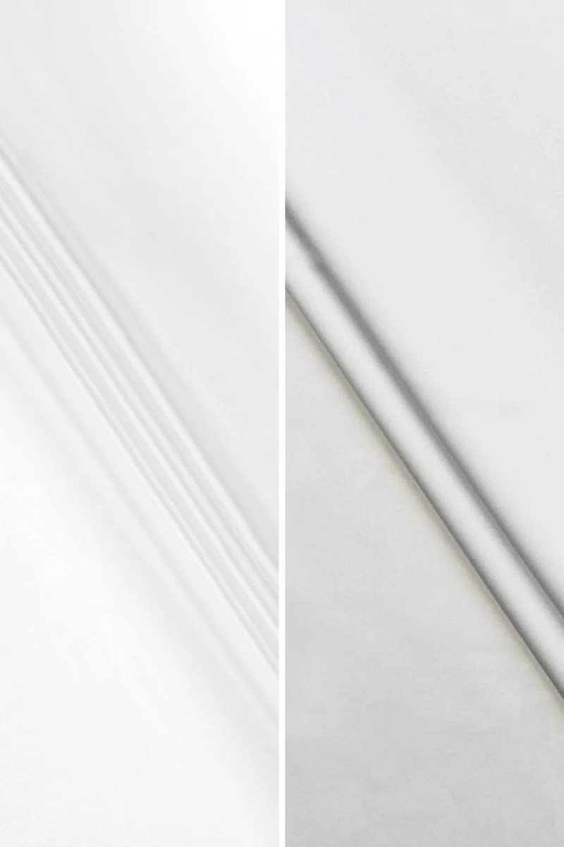 Italiensk viskossatin i två färger - vit och ljusgrå. Tyget är mjukt, flytande, icke-elastiskt, mjukt vid beröring och ogenomskinligt. Den ligger vackert och satinfinishen ger elegans till den. Du kan trolla fram luftiga klänningar, kjolar, skjortor eller blusar av den. Den kan också användas som bas för mer ömtåliga tyger och spetsar.