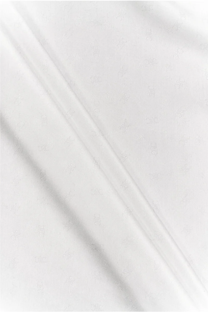 Jacquardviskos i små krämfärgade mönster. Vanliga teman är placerade i olika riktningar, och det finns ganska många av dem. Ett stycke är 9 mm långt och 6 mm brett. Tyget är mjukt, flödande, behagligt att greppa och icke-elastiskt. Tillverkad i satinvävd ser den mycket ädel ut och kommer från kollektionen hos det välkända modehuset. Materialet är perfekt för att sy en blus, skjorta, kjol eller klänning.